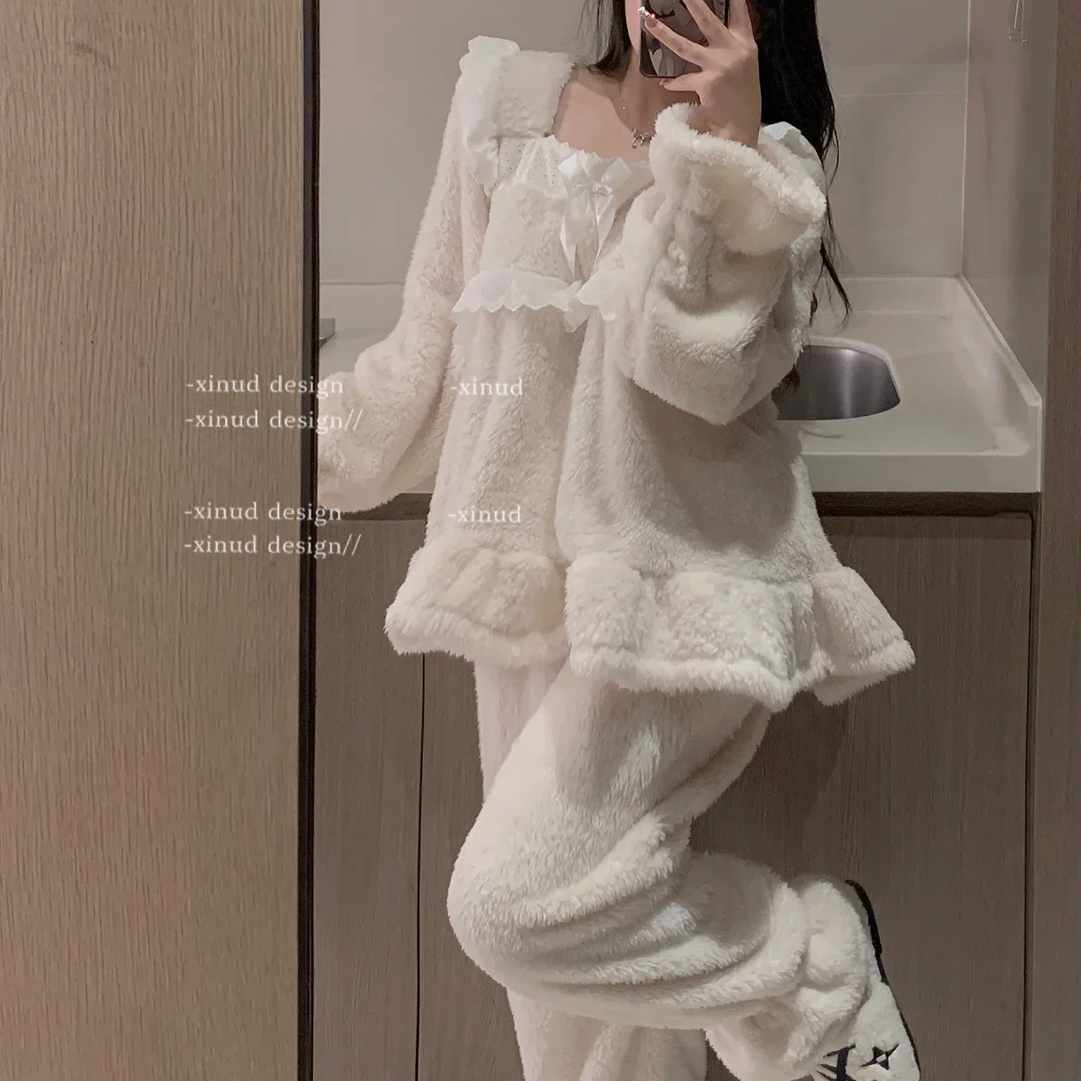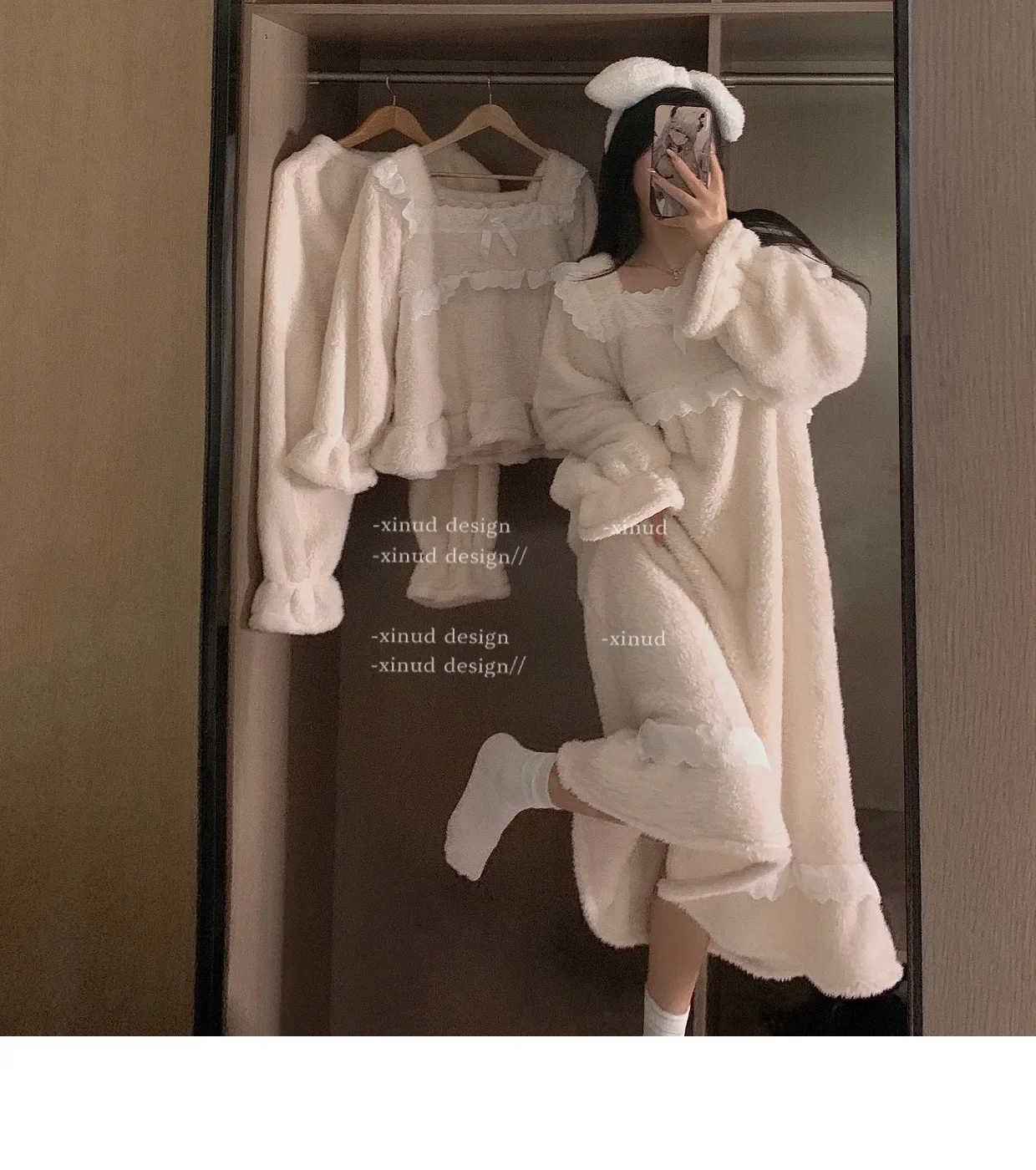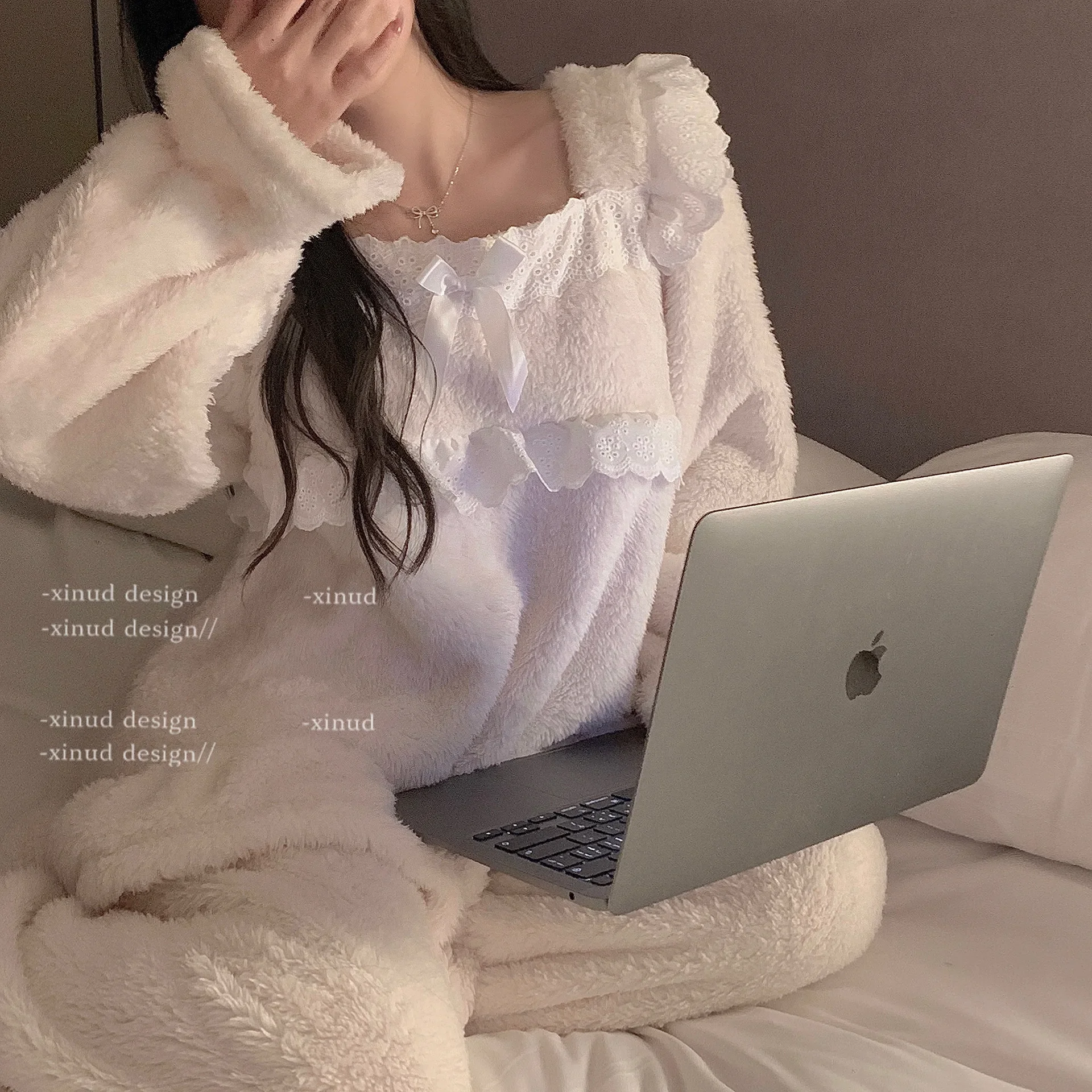 منامة المرجان المخملية الإناث الخريف والشتاء جديد فضفاض مريح نمط المحكمة مبطن سميكة ملابس المنزل دعوى السيدات