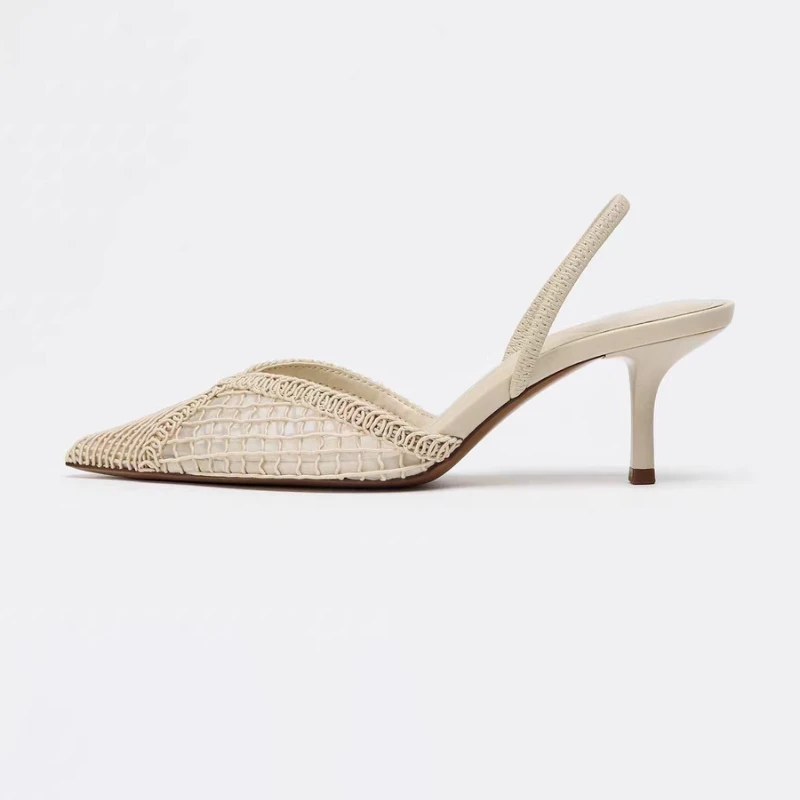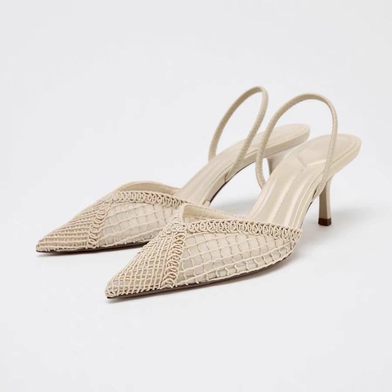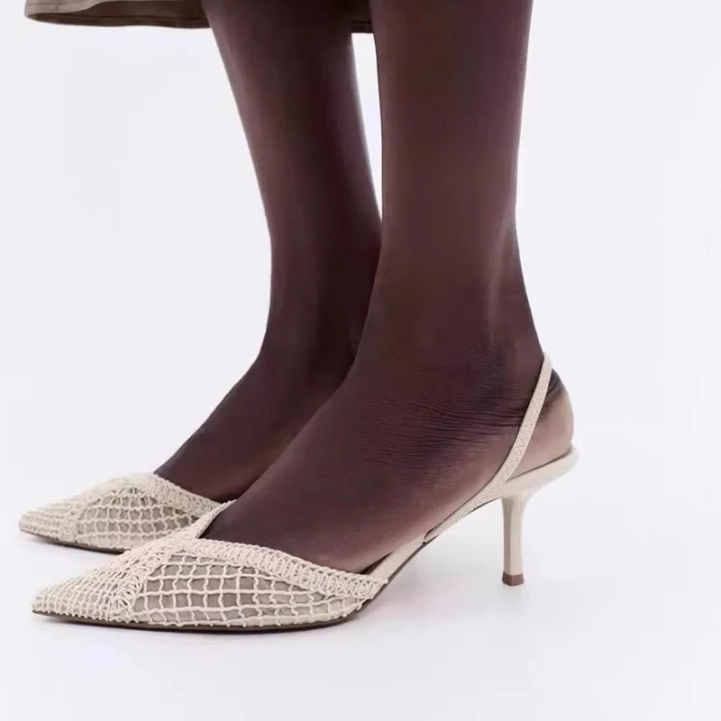 موضة الأسود شبكة جوفاء المنسوجة العلامة التجارية مضخات النساء الراحة أشار تو الضحلة صنادل عالية الكعب أنيقة رقيقة كعب أحذية مصممين