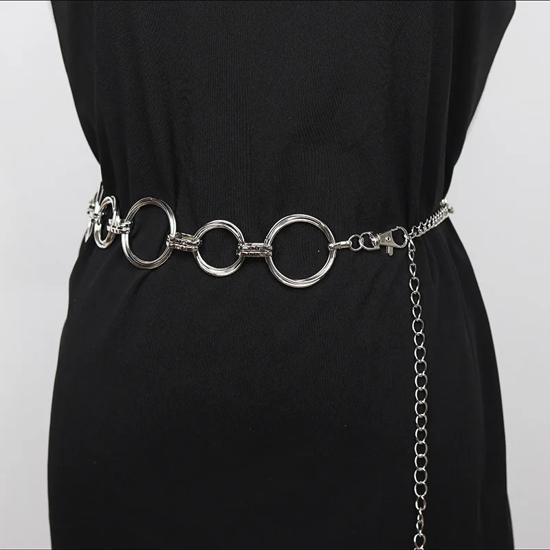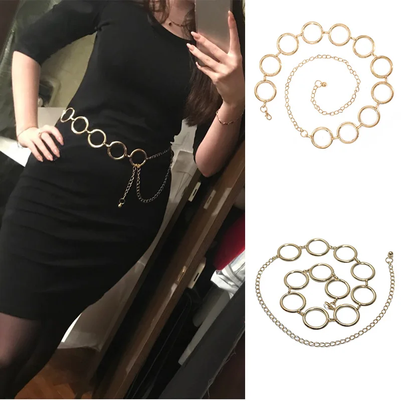موضة دائرة معدنية حزام على شكل سلسلة المرأة الذهب والفضة سبيكة مستديرة حزام مع شرابة طويلة الإناث حزام لفستان