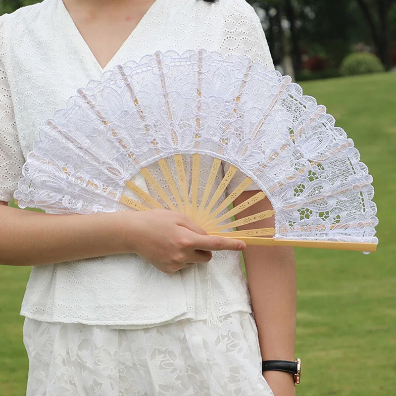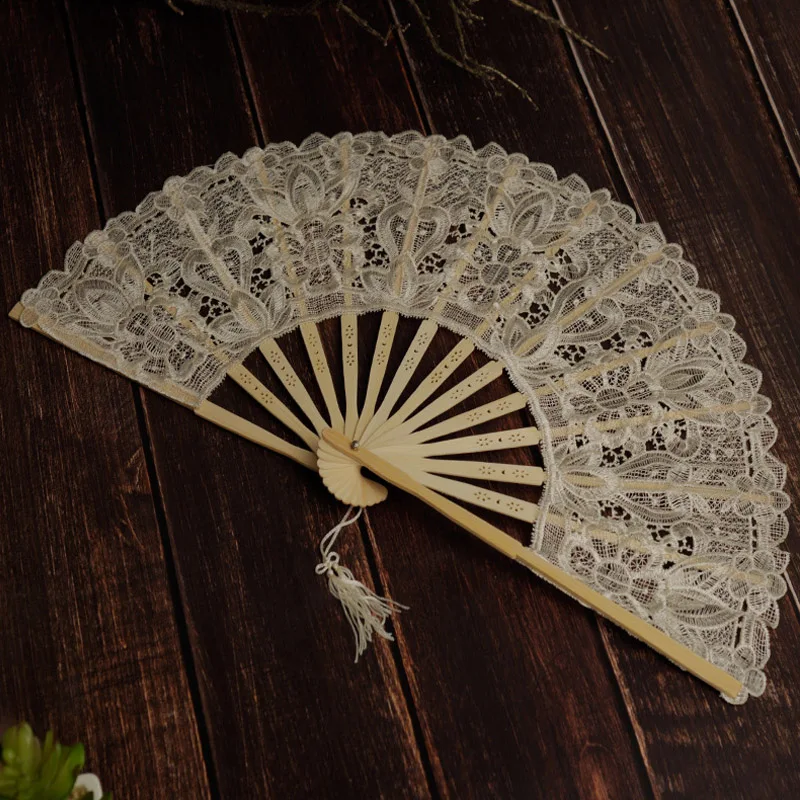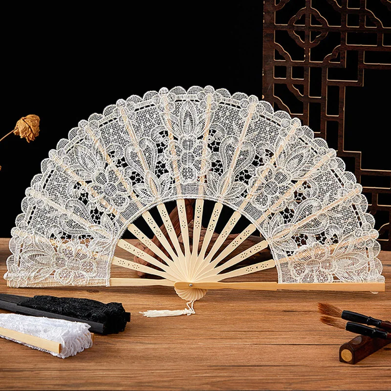 مروحة دانتيل قابلة للطي مع أضلاع مجوفة بشرابة أنيقة على الطراز العتيق مروحة محمولة مع قلادة شرابة لديكور المنزل وحفلات الزفاف