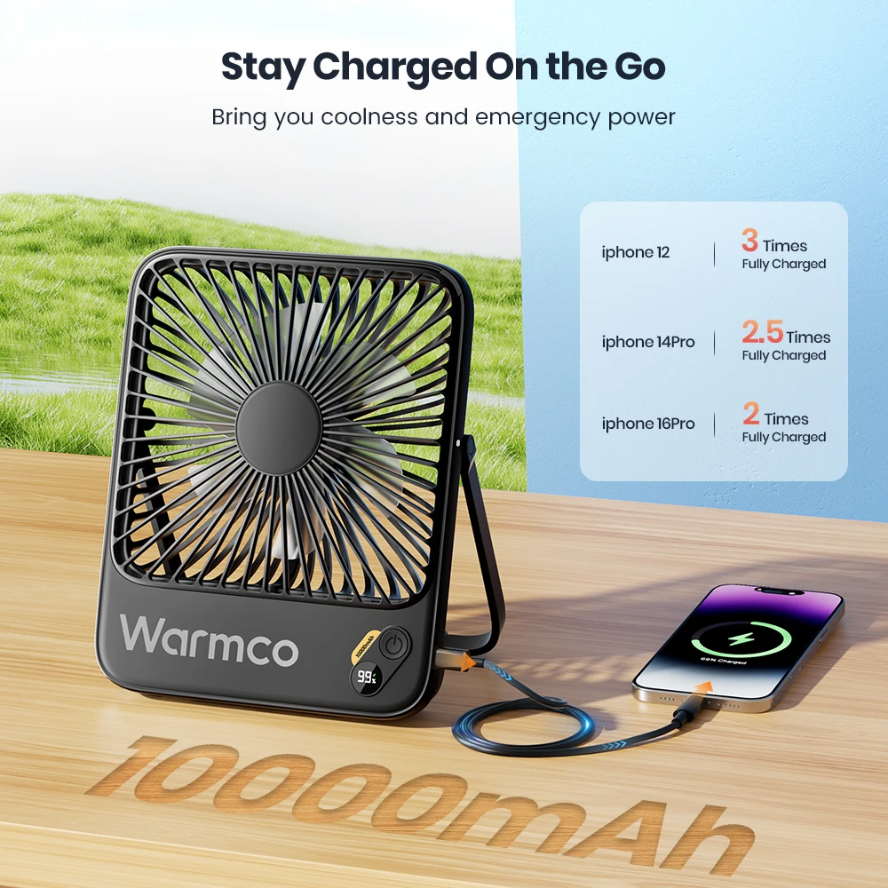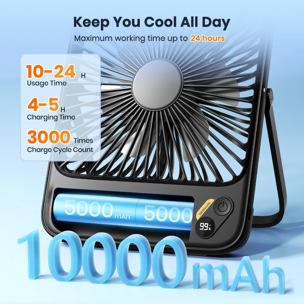 أداء تبريد قوي وفعال: مزود ببطارية قابلة لإعادة الشحن عالية السعة 10000 مللي أمبير في الساعة، ابق باردًا طوال اليوم مع ما يصل إلى 10 إلى 24 ساعة من التشغيل المستمر من شحن كامل واحد.توفر إعداداتها ذات 4 سرعات وتصميمها المكون من 5 شفرات تبريدًا قويًا وهادئًا للغاية، مما يجعلها مثالية للمكاتب والمنازل والمغامرات الخارجية
