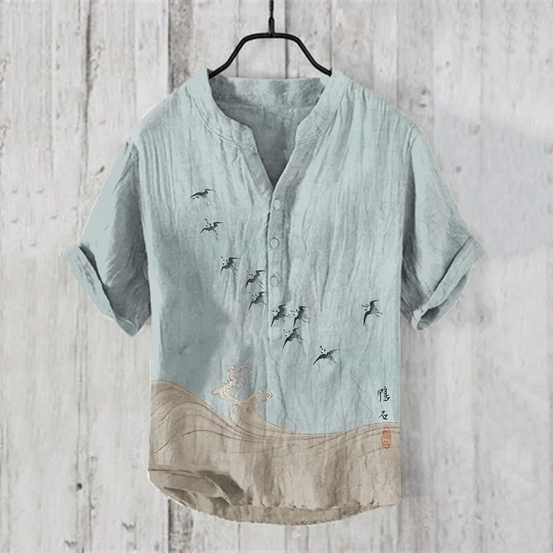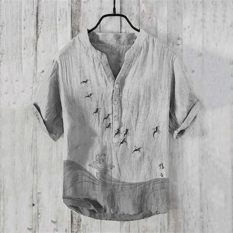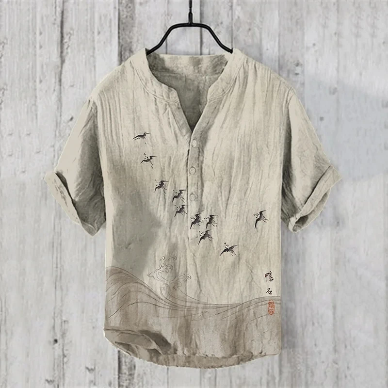 مزيج الكتان للرجال مثير للاهتمام بأكمام قصيرة، ملابس علوية مريحة للرجال برقبة على شكل حرف V قابلة للتنفس