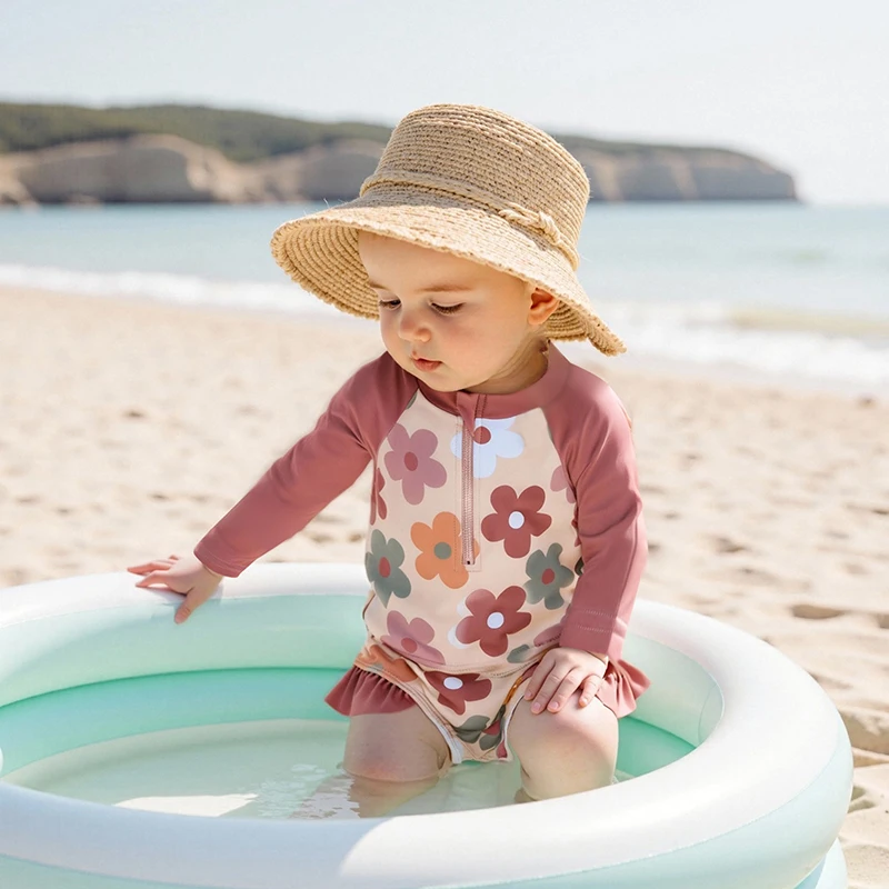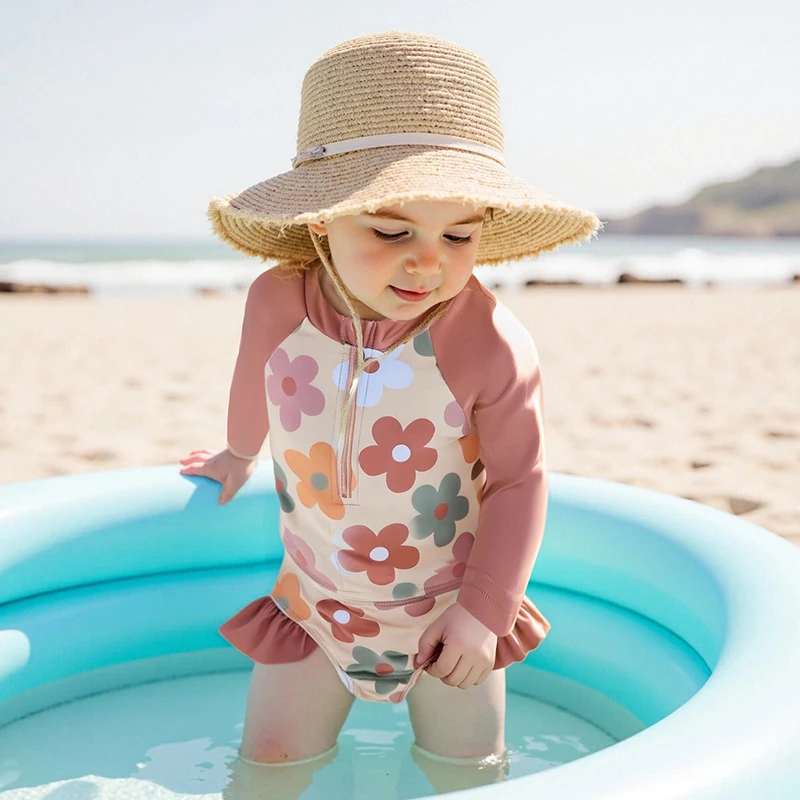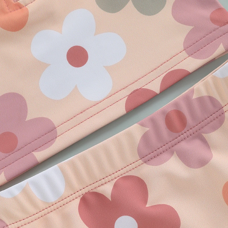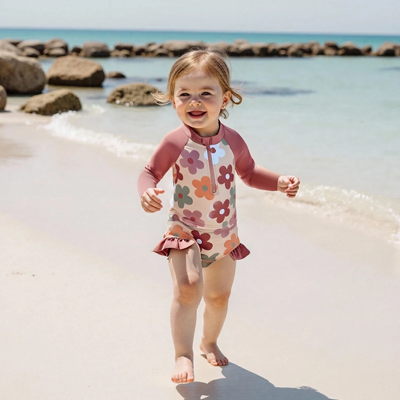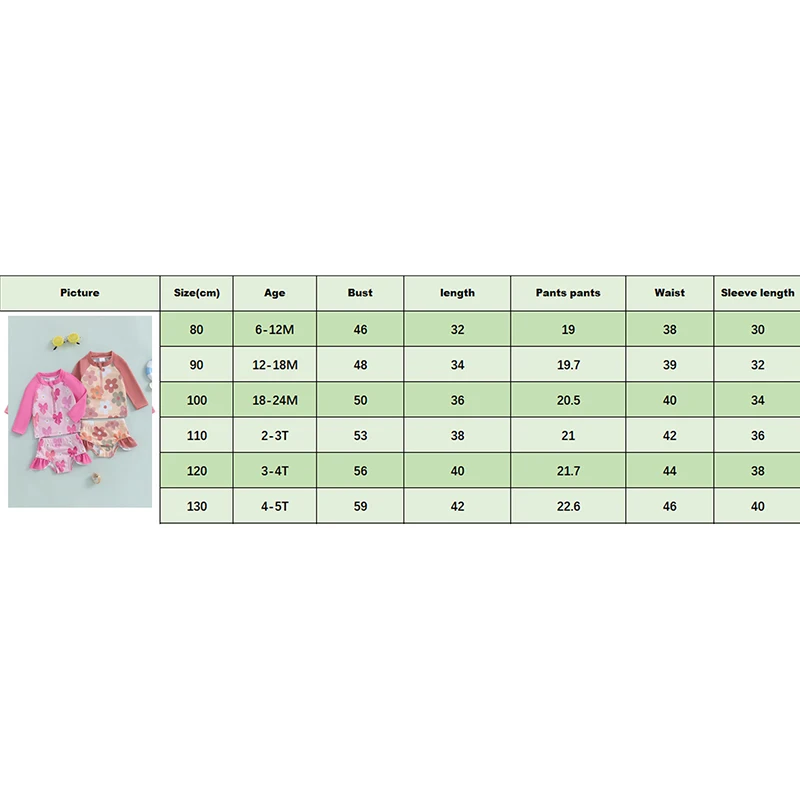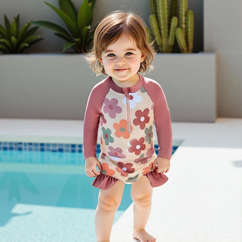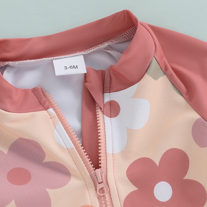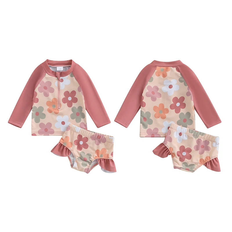 طقم ملابس سباحة للأطفال الصغار والبنات الصغيرات طقم ملابس سباحة بسحاب للزهور وأكمام طويلة وسراويل سباحة مكونة من قطعتين طقم بدلة استحمام