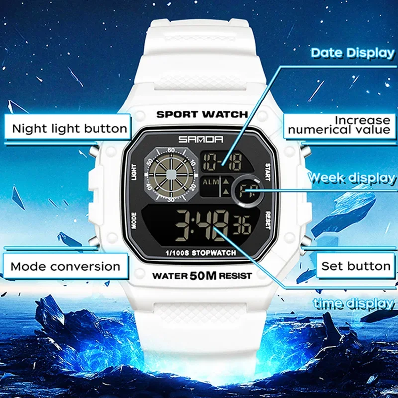 SANDA ساعة إلكترونية عصرية للرجال رياضية متعددة الوظائف مقاومة للماء LED شاشة واحدة صغيرة مربعة إلكترونية