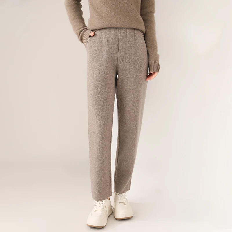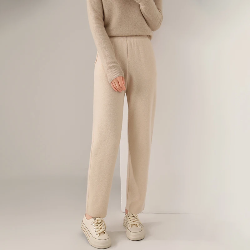 سراويل صوفية 100% للخريف والشتاء عالية الخصر بأرجل صغيرة، سراويل هارين، سراويل كشمير ذات تسع نقاط للنساء