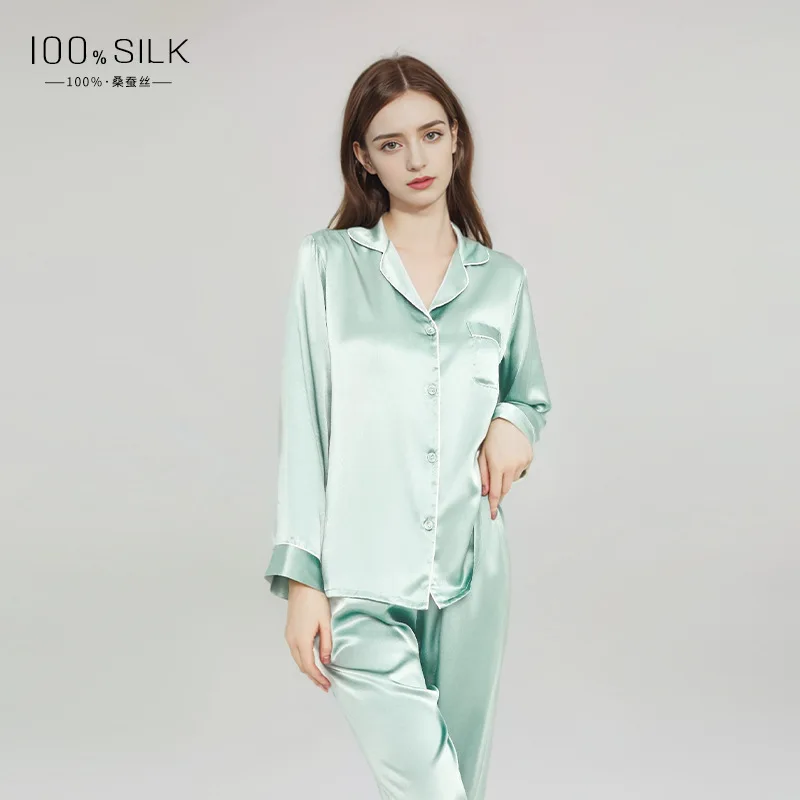 صيف جديد بيجامة من الحرير الحقيقي المرأة طويلة الأكمام بنطلون 100% التوت الحرير ملابس المنزل باردة دعوى 2 قطعة بلون ملابس خاصة