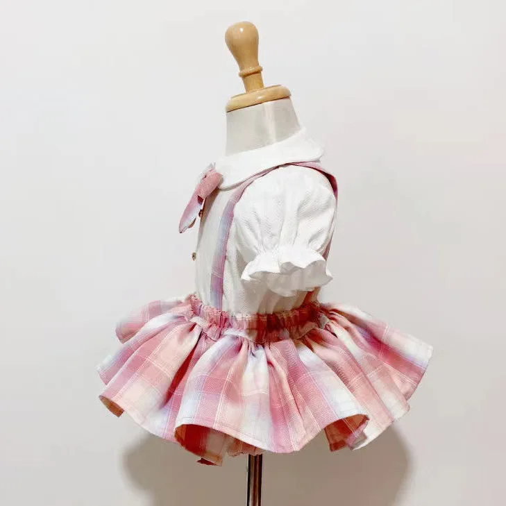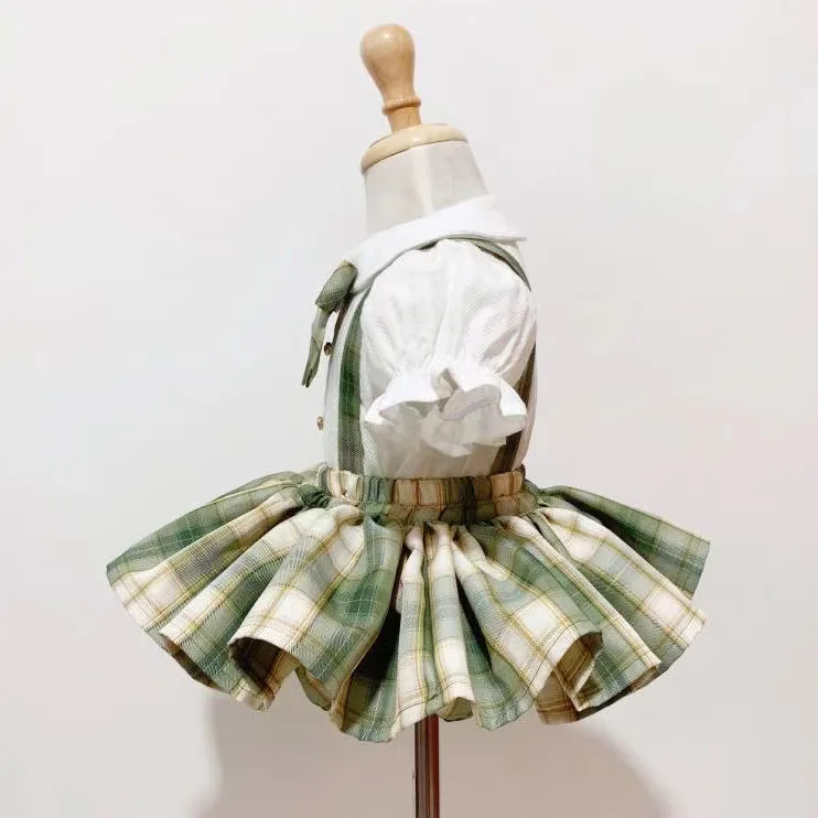 طقم بدلة بناتي أحادي اللون مكون من قطعتين ، رقبة بولو ، أكمام فقاعية ، بلوزة أحادية اللون ، زي JK موحد ، فستان بحزام ، تنورة نصف للأطفال ، صيف ، جديد ،