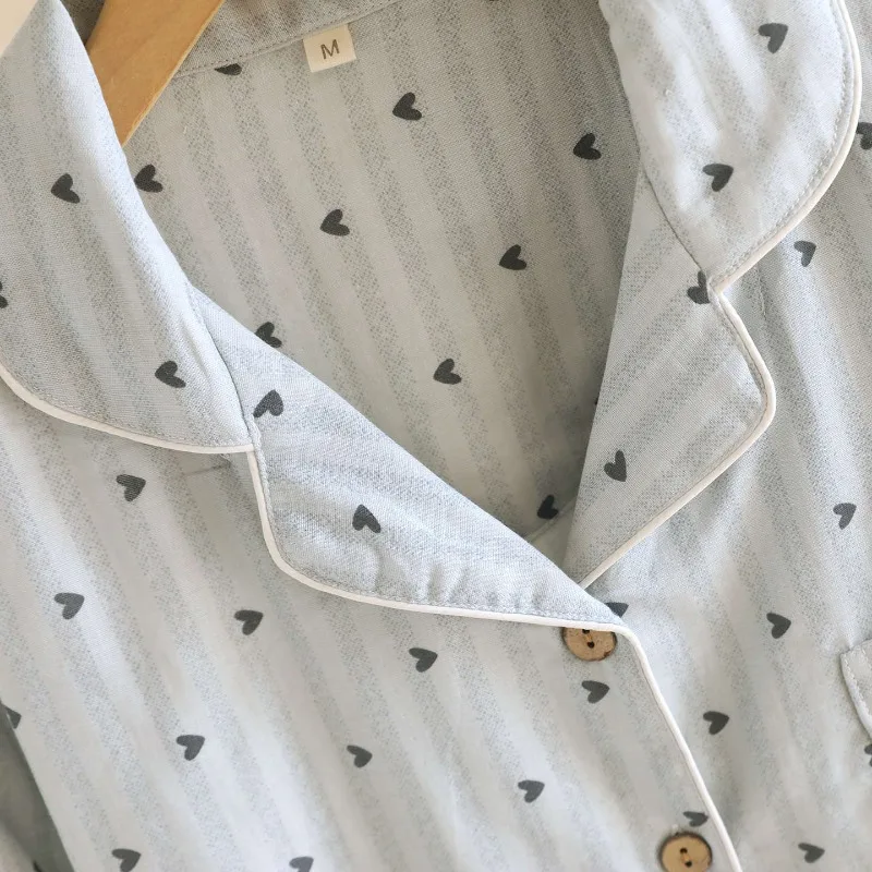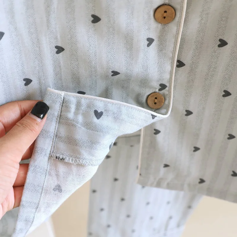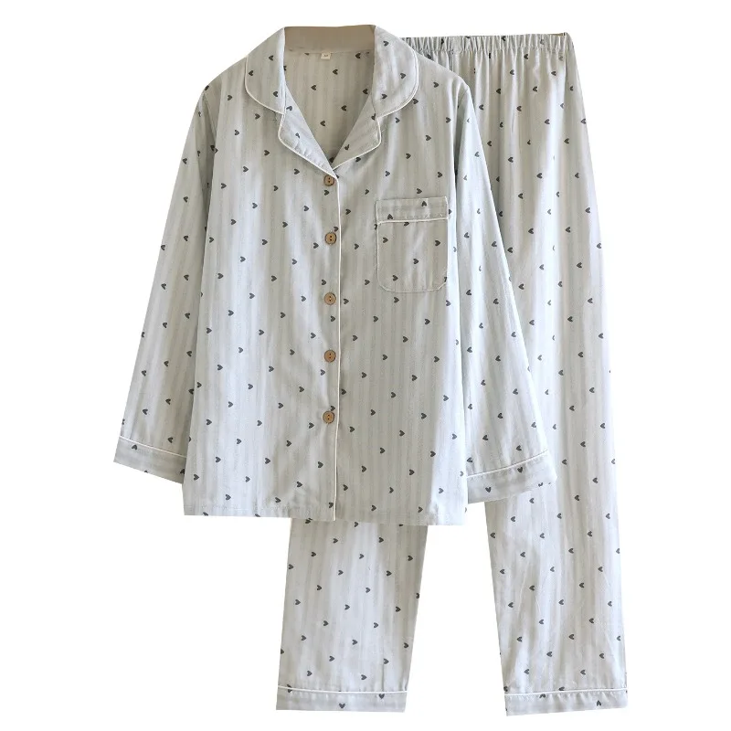 طقم بيجامة نسائي للربيع والخريف لعام 2025 100% قطن شاش شريط عمودي بأكمام طويلة طقم ملابس منزلية مكون من قطعتين