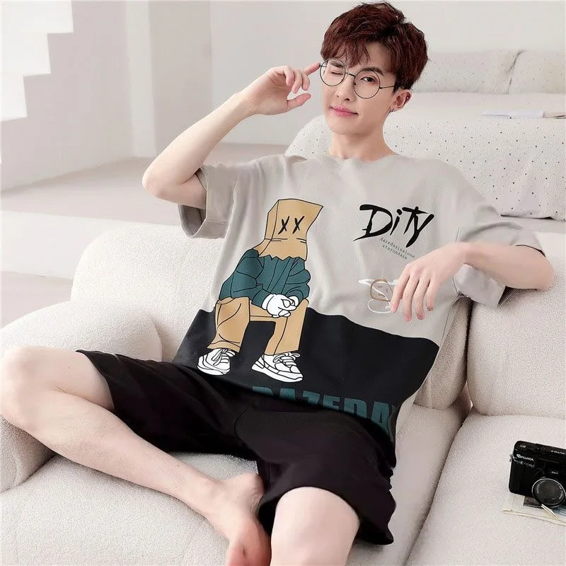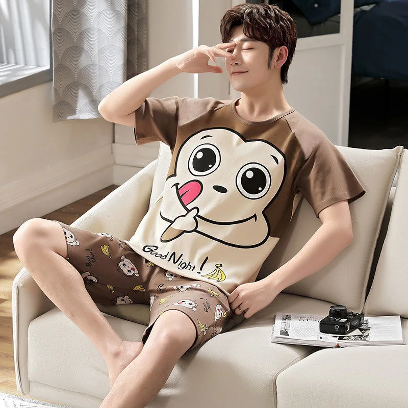 طقم بيجامات كرتونية كاجوال للرجال ، رقبة مستديرة ، أكمام قصيرة ، ملابس مريحة رفيعة ، طالب ، مراهقة ، صيف ، جديد