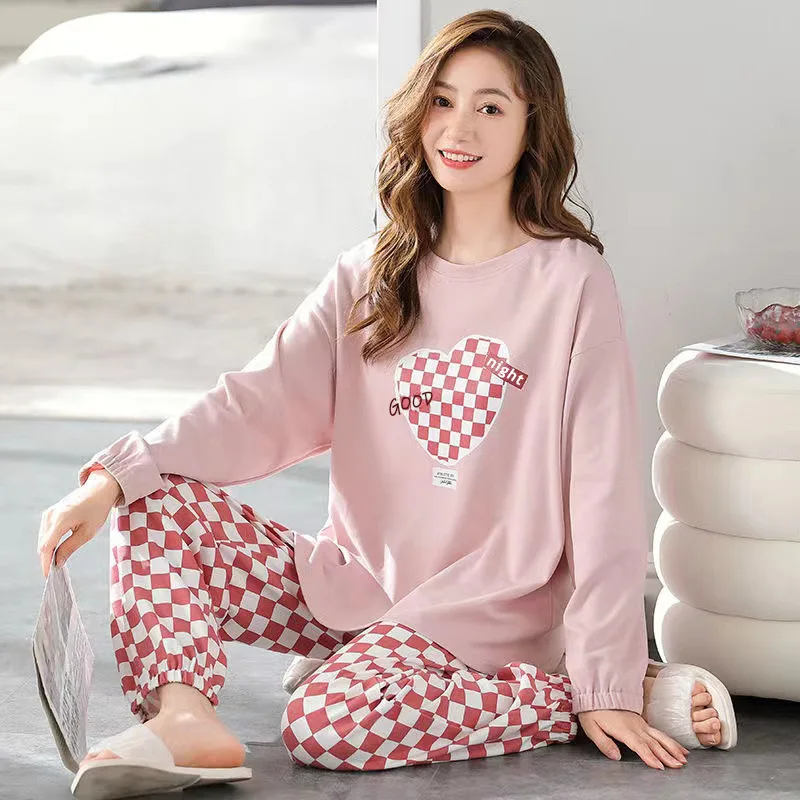طقم بيجامات نسائية بأكمام طويلة ، بنطلون طويل منقوش ، فضفاض ، طالب ، ملابس منزلية ، أزرق ، Tw ، مهترئ