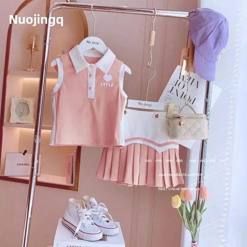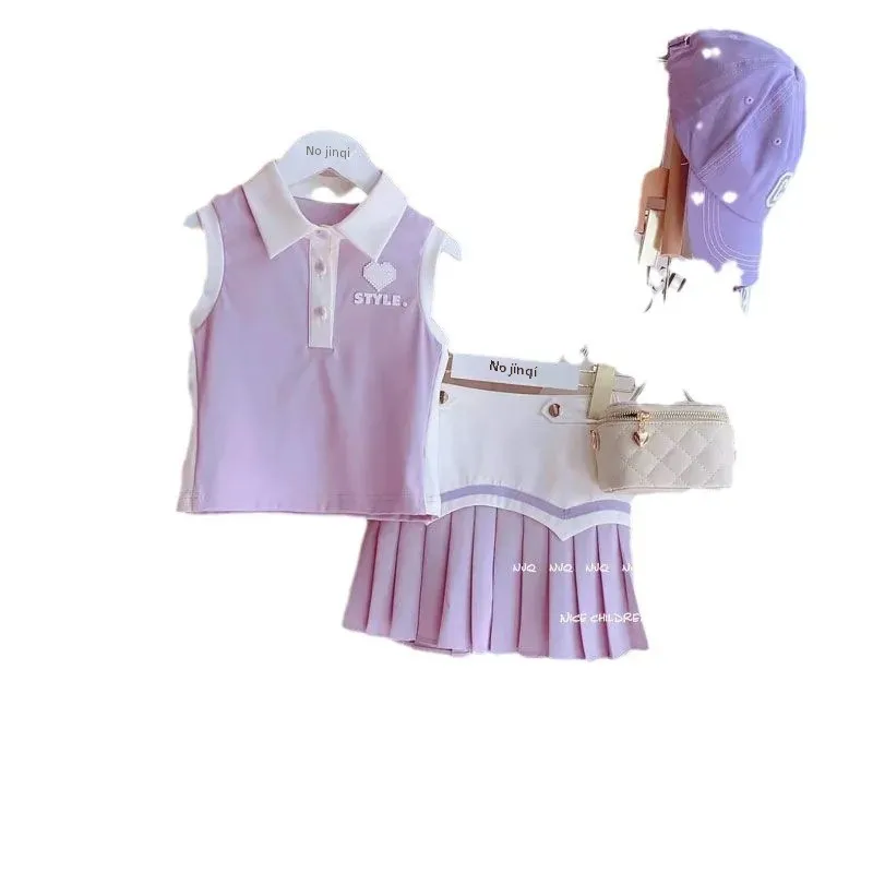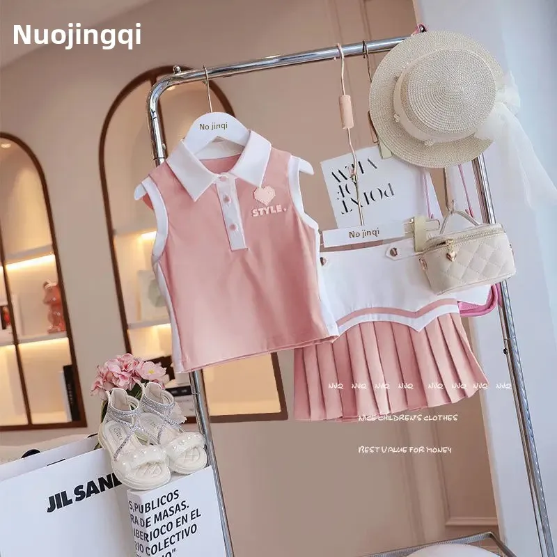 طقم فستان أطفال أنيق صيف جديد وصول رياضي بولو طوق فستان قصير 2 قطعة مجموعة للفتيات سن 3-10