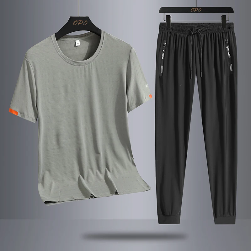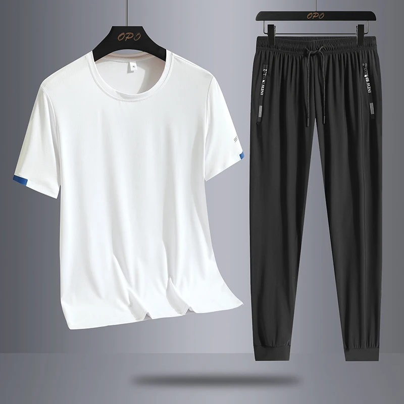 طقم رياضي من قطعتين من الحرير الجليدي للرجال ، أكمام قصيرة ، بنطلون طويل ، تجفيف سريع ، موضة فضفاضة ، طراز جديد ، الصيف ،