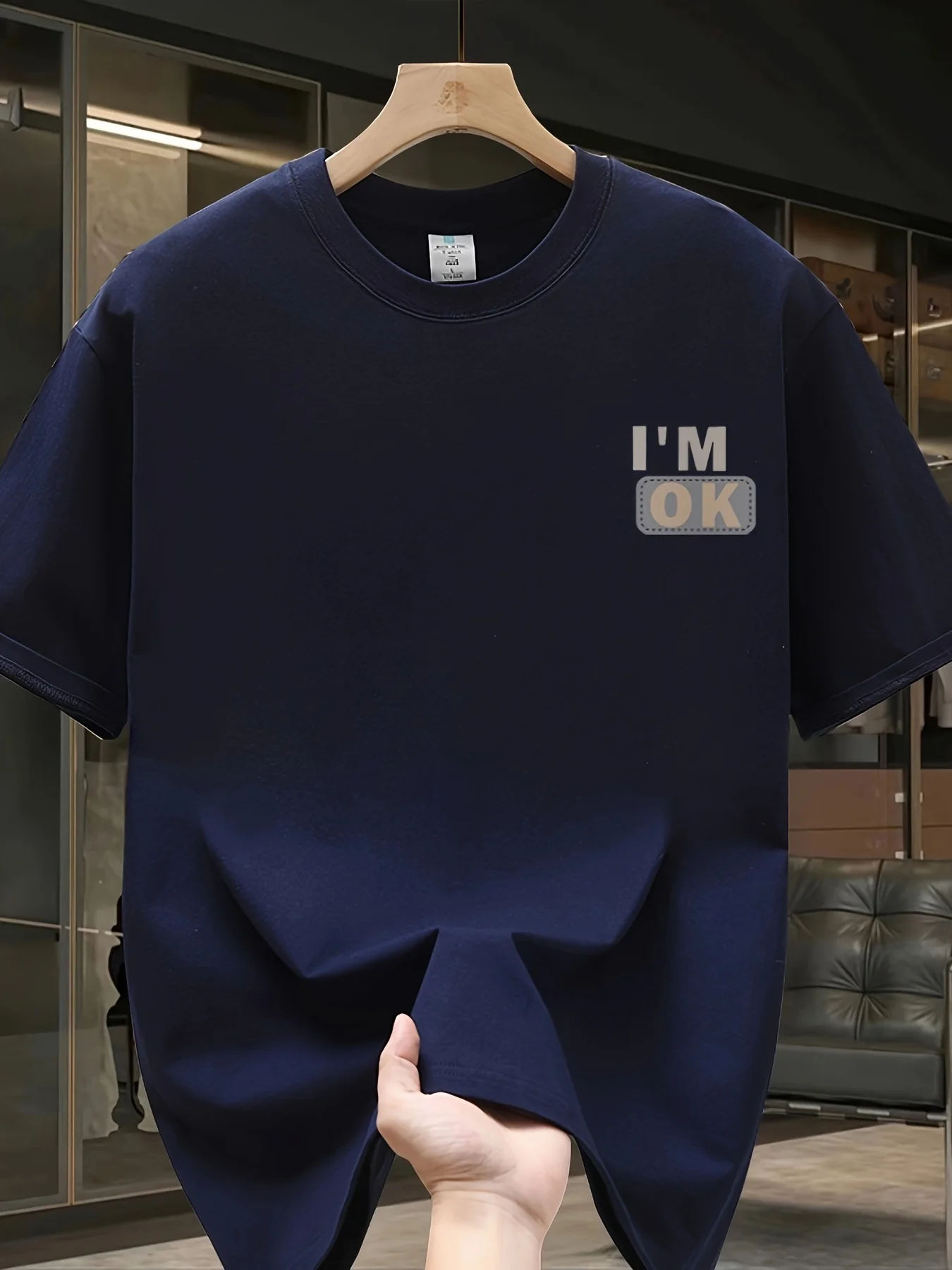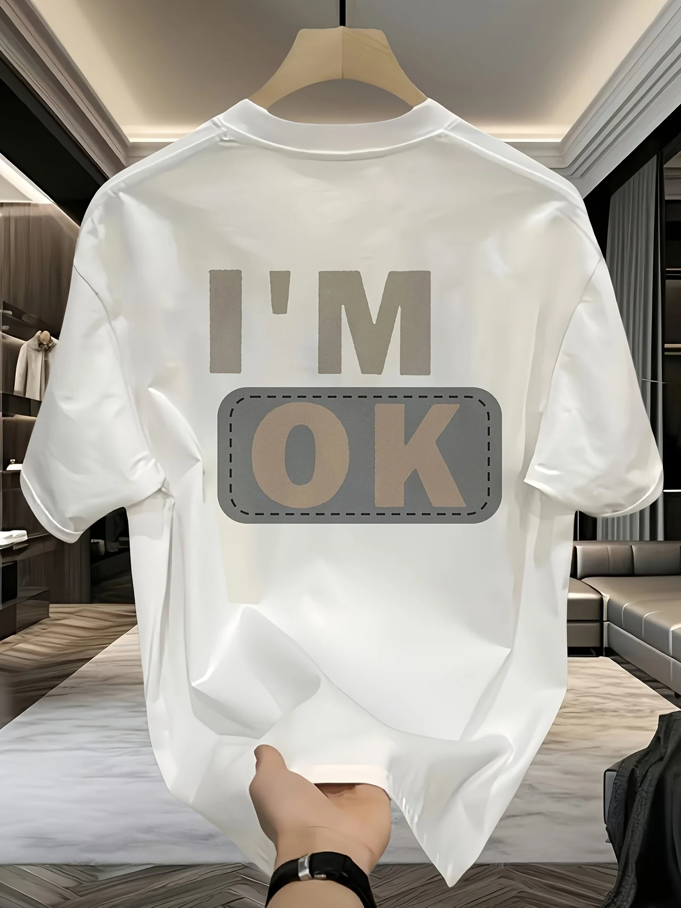تي شيرت رجالي صيفي 100 قطن عصري كاجوال رياضي فضفاض أنيق مطبوع عليه حروف I'm OK برقبة دائرية وأكمام قصيرة